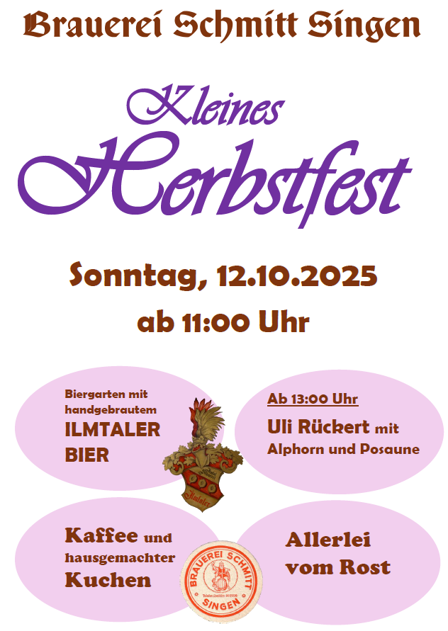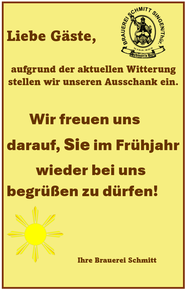 Willkommen Herzlich Willkommen auf der Homepage der Museumsbrauerei Schmitt in Singen/Thüringen. Hier finden sie alle Informationen zu unserem einmaligen Bier-Erlebnis, unserer Brauerei, unseren Maschinen und unseren Veranstaltungen.